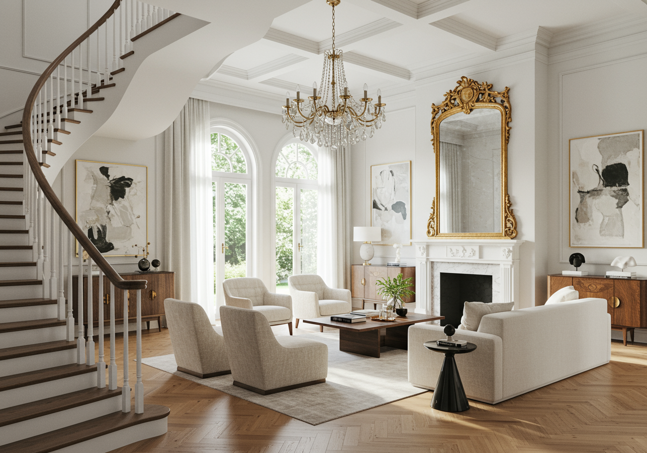 The parlor level offers a living room with full-length, round-arch windows that face south over Stuyvesant Square Park.