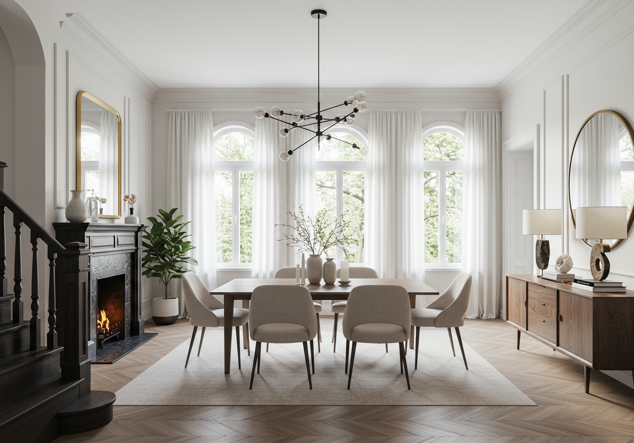 The dining room has a fireplace, high ceilings, and hardwood floors.