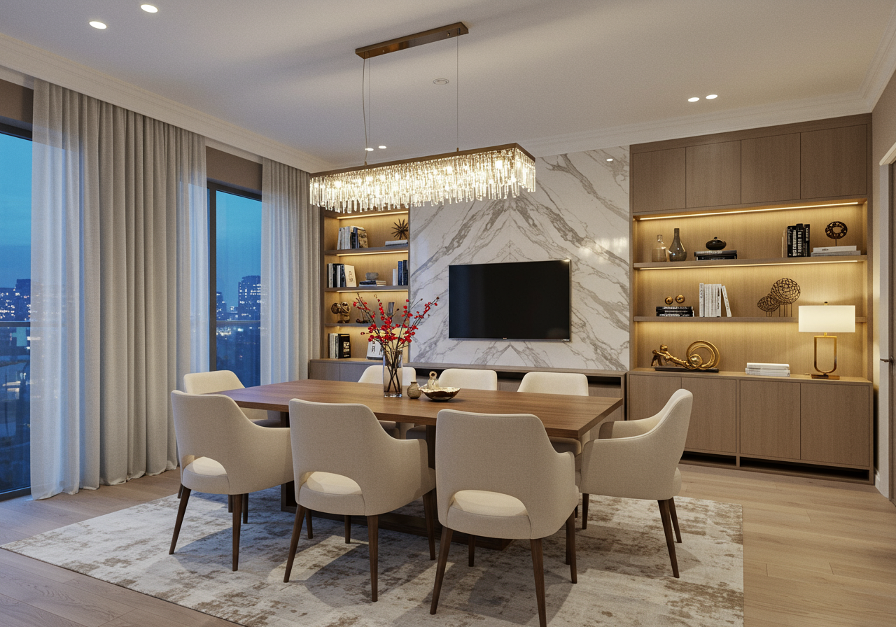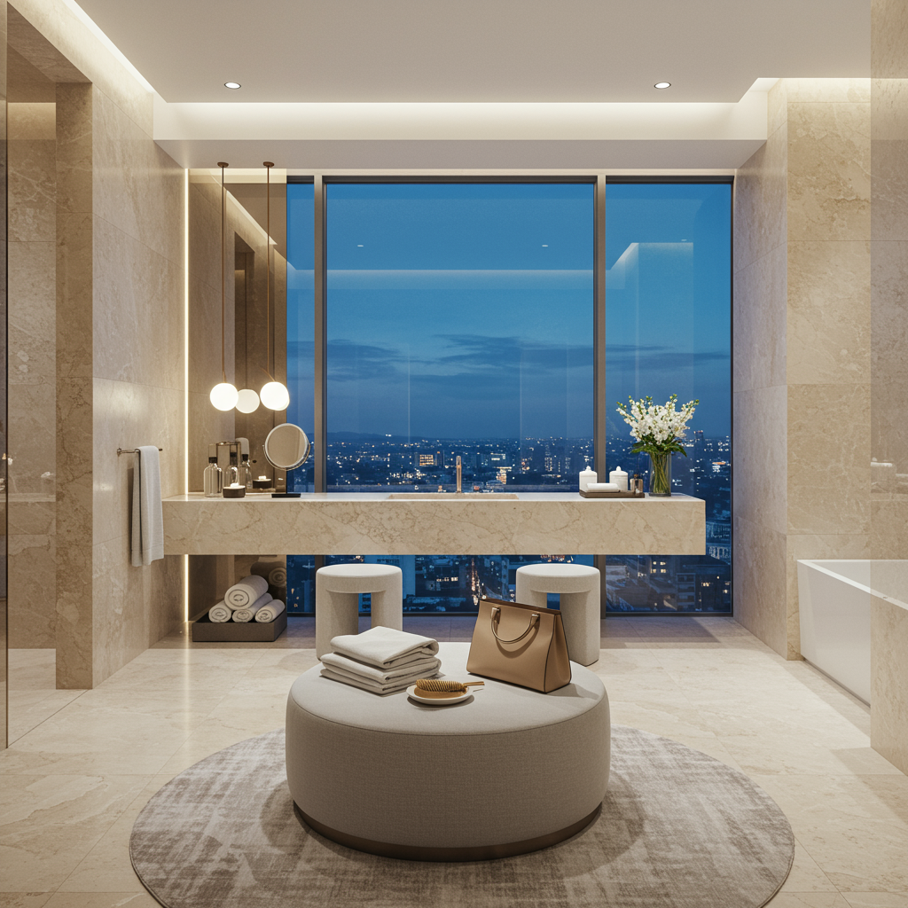 These carefully selected tones allow even the smallest details to stand out and complement the apartment views, whether it be the polished nickel metal trims or the subtle veining of the different marble varieties.