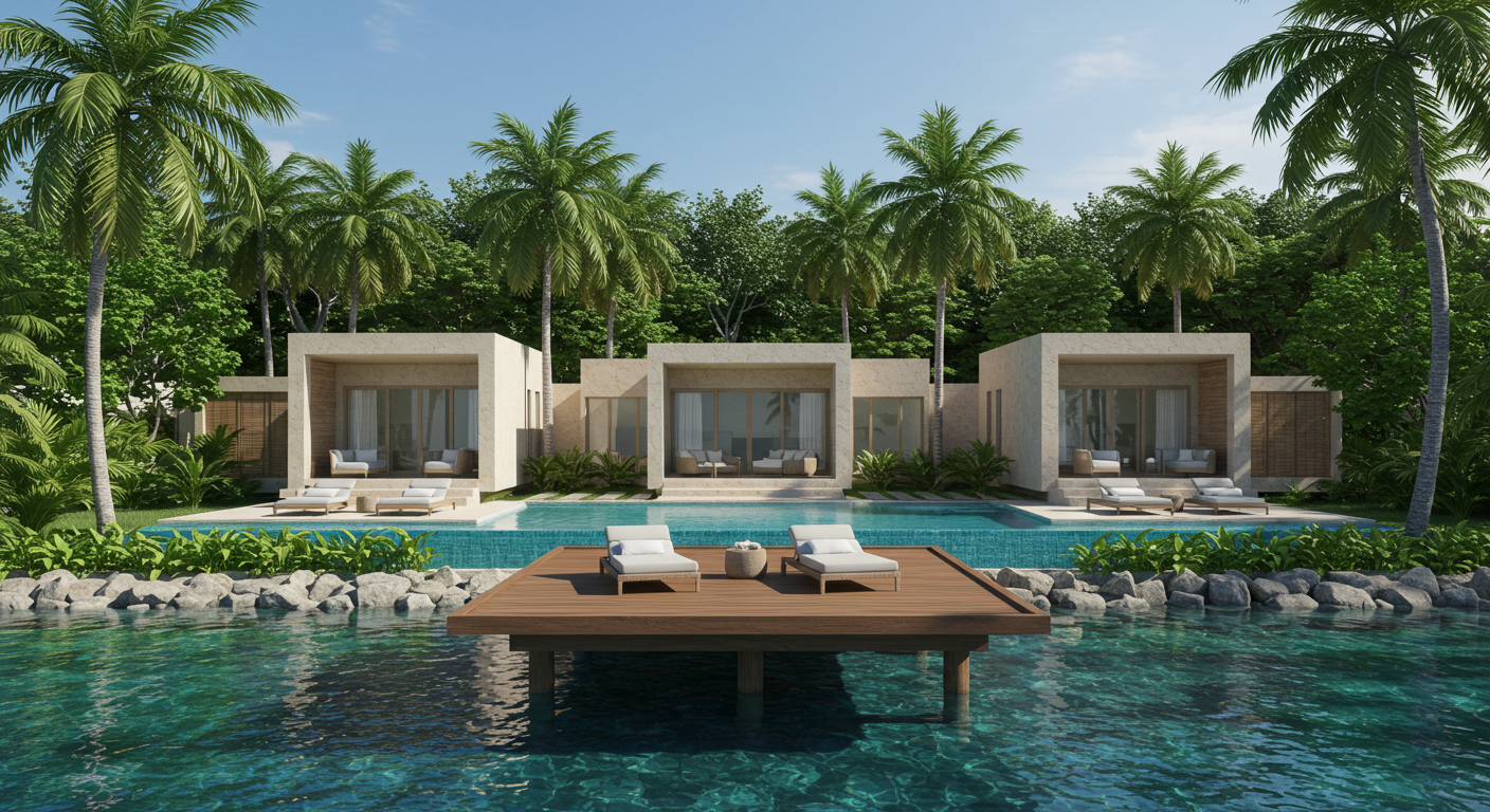 At New Luxe Resort in Bimini. The 750-acre property includes a 50-key hotel, 54 branded residences, and an onsite beach club.